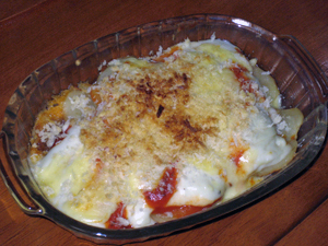ホワイトソースの上に市販のピザソースをかけて、シュレッドチーズ・パン粉・パルメザンチーズをたっぷりかけてトースターなどで焼き上げて出来上がり。